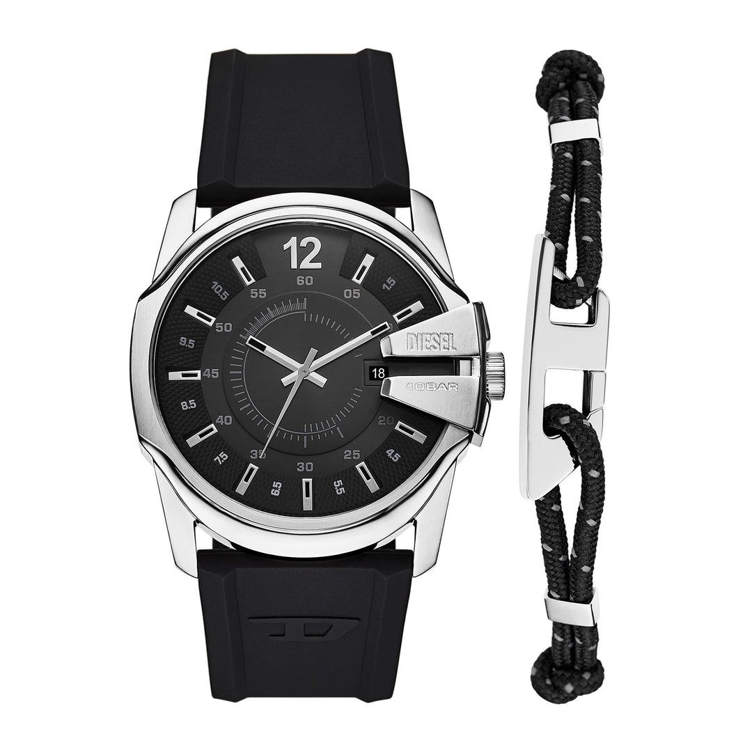 Diesel Men's Master Chief Three-Hand Date Black Silicone Watch and Cord Bracelet Set