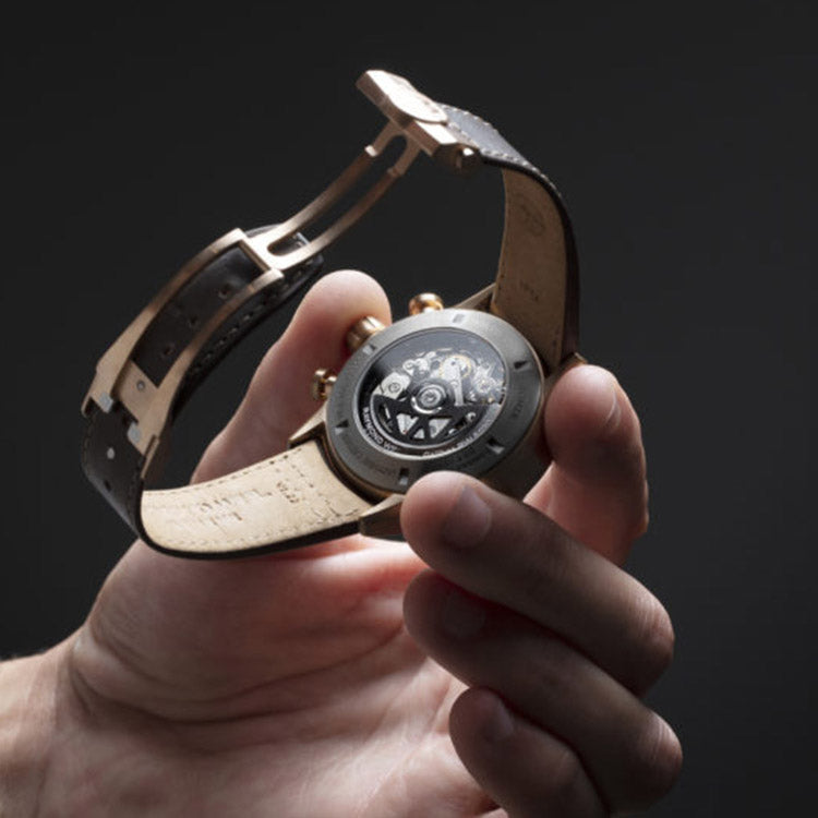 Black with gradient-effect from the center, counters in bronze colour, rose gold applique indexes enhanced with white Super-Luminova®