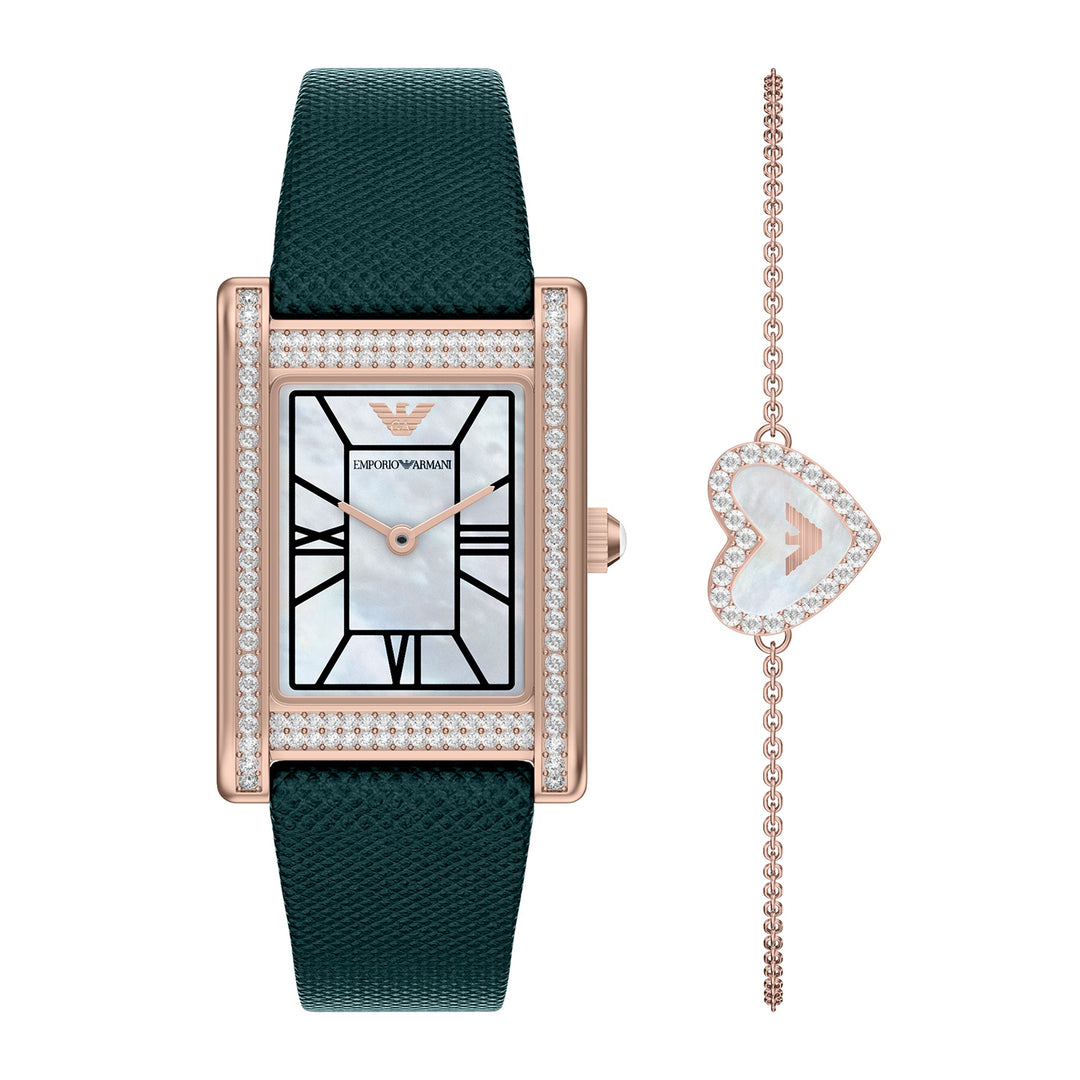 Emporio Armani Women's Two-Hand Green Leather Watch and Rose-Gold Tone Bracelet Set