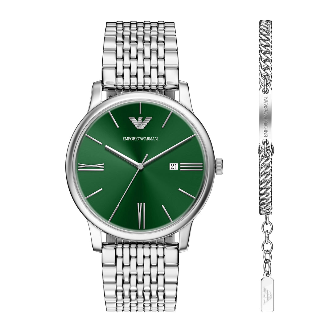 Emporio Armani Men's Three-Hand Date Stainless Steel Watch and Bracelet Set