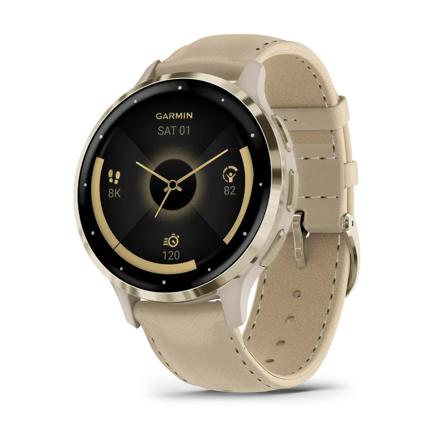 Garmin Venu 3S Soft Gold Stainless Steel Bezel With French Gray Case And Leather Band Includes French Gray Silicone Band Full Color Display Watch
